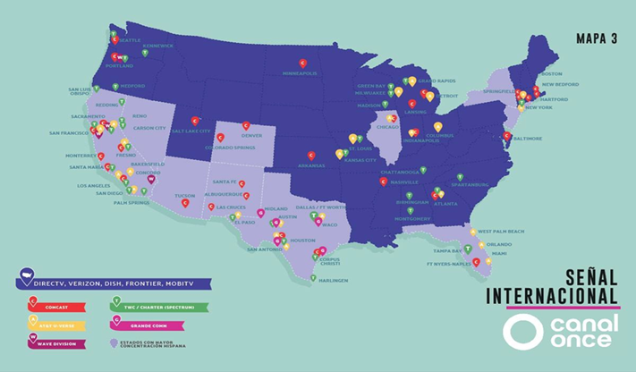 La Señal Internacional de Canal Once llega a más de dos millones y medio de suscriptores en Estados Unidos y el sur de Canadá a través de diversos servicios de televisión de cable y satelital.
